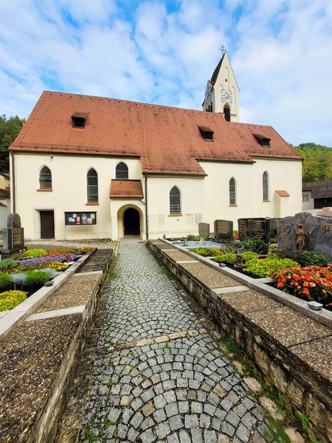 Von Dietfurt aus wandern wir über eine Brücke und gelangen über einen Abstecher zur Wallfahrtskirche „Zu den drei Elenden Heiligen“ in Griesstetten. Die Wallfahrtskirche ist im Barockstil erricht und ein echter Hingucker!