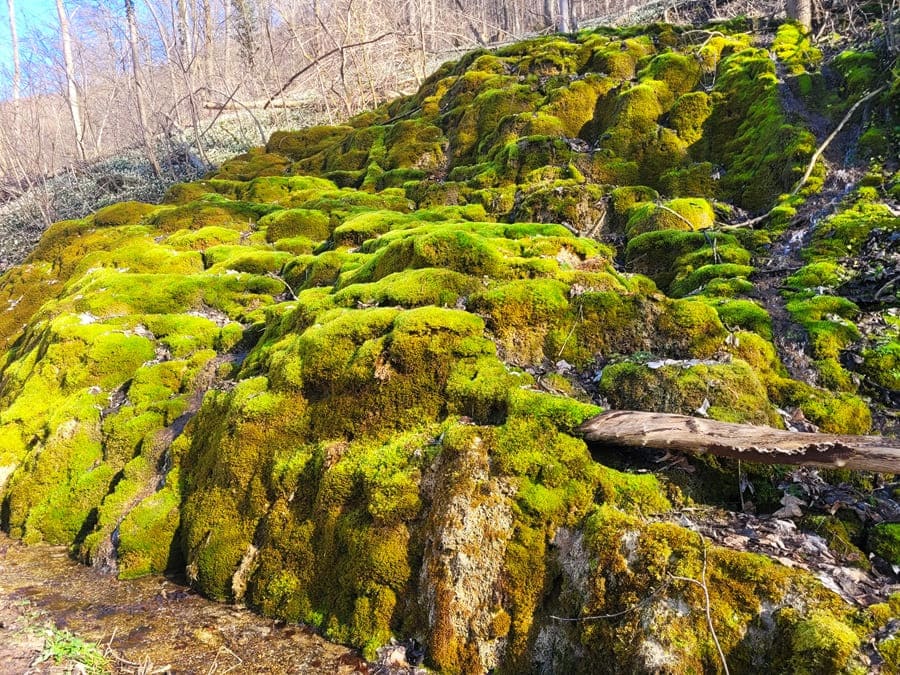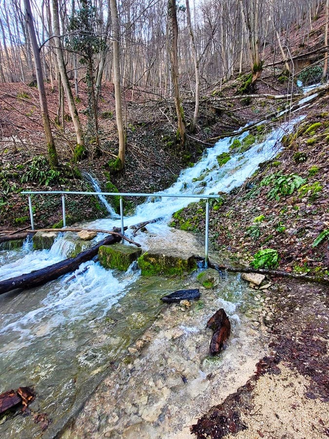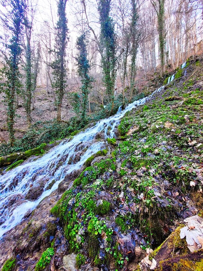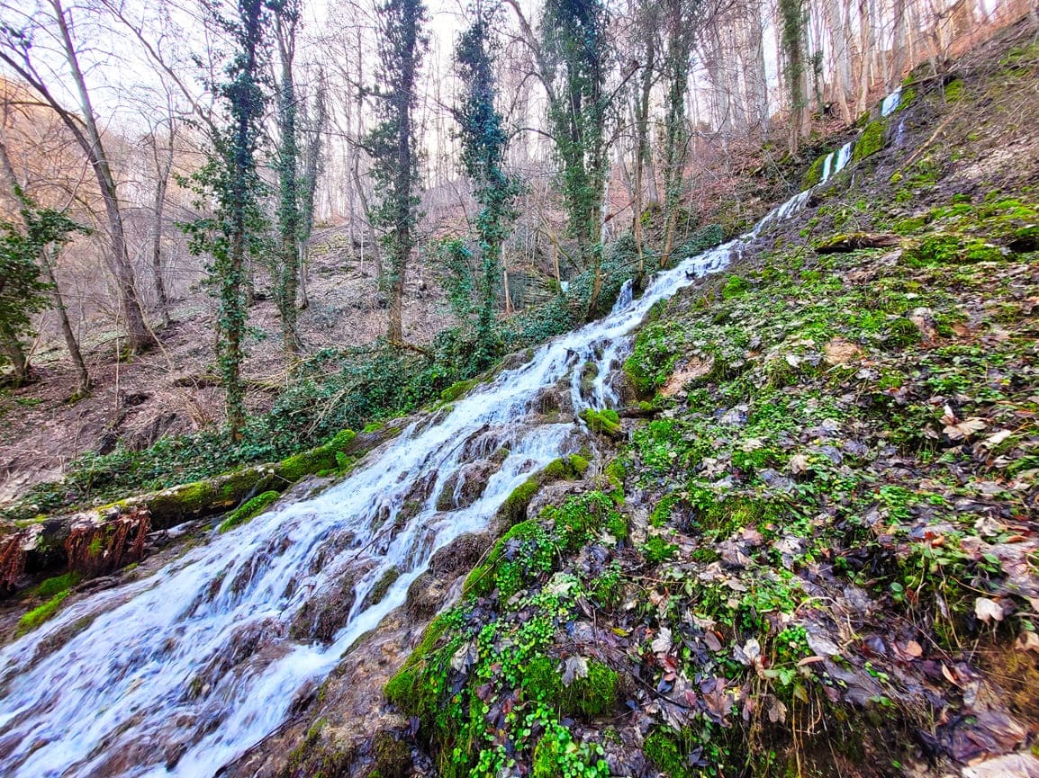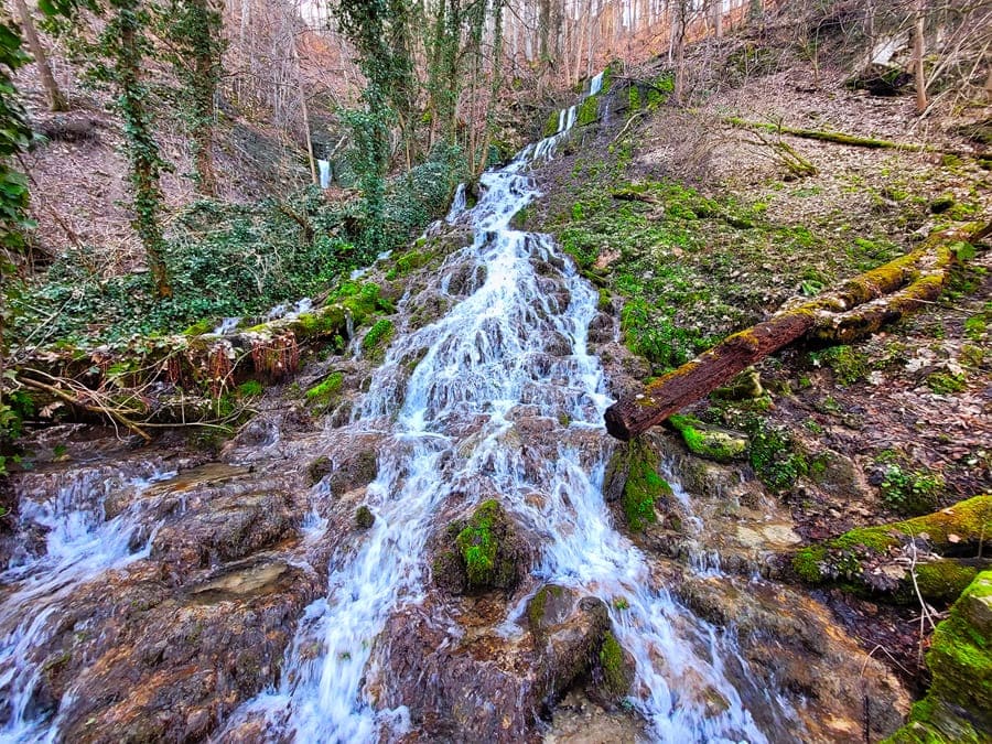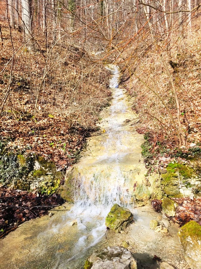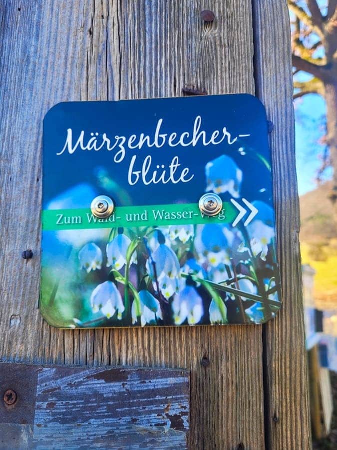 Burgruinen, Klöster, Museen: All dies hat der Wald- und Wasserpfad nicht zu bieten. Auf breiten Waldwegen führt uns die Route weiterhin leicht bergauf. Die Tage zuvor hat es ordentlich geregnet. Und was uns dann entlang des Wanderwegs erwartet, verblüfft uns doch. Immer abwechselnd können wir jetzt, Anfang März, ganze Teppiche an Märzenbechern und herunterfallende Wassermassen beobachten.