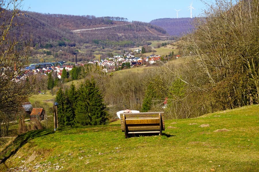 Von Stuttgart aus sind wir nach Geislingen an der Steige gefahren und dort in den Bus nach Bad Überkingen gefahren: Die Fahrt dauert gerade einmal eine Stunde. Direkt an der Autalhalle ist der Wald- und Wasserweg auch schon ausgeschildert. An der Halle gibt es die erste Einkehrmöglichkeit. Die ersten Meter führen uns direkt einige Höhenmeter bergauf, sodass wir einen Blick zurück werfen können.