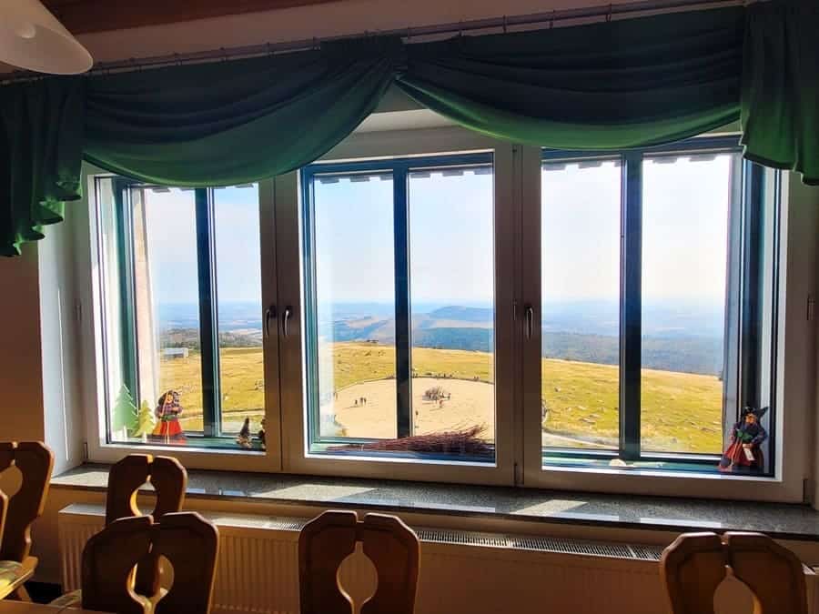 Fast viele Brocken-Besucher gar nicht wissen: Auch im Brockenhotel gibt es sowohl das Turmcafè als auch ein „Touristensaal für den schnellen Imbiss“. Der ist uns tatsächlich vor Ort gar nicht aufgefallen, dieser Touristensaal. Vermutlich hatte er schlicht und einfach schon geschlossen oder an jenem Tag gar nicht erst geöffnet. Stattdessen zog es uns schnurstracks in das Turmcafé mit genialer Aussicht!