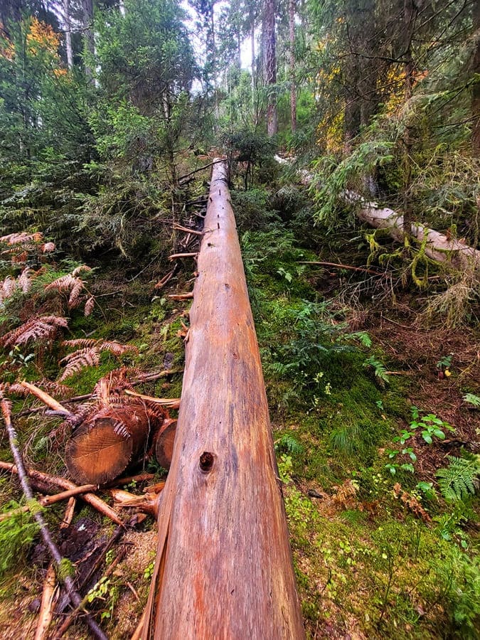 Schon hier wird uns klar, warum dieser erst im Jahr 2024 eröffnete Wanderweg als Geheimtipp im Schwarzwald gilt: Gefühlt über 80% der Strecke verlaufen auf schmalen, naturnahen Pfaden. Kaum Teer, kaum Schotter, naturbelassene Naturpfade prägen diesen Geheimtipp in Enzklösterle. Kurz vor der Ortschaft Gompelscheuer überqueren wir die Große Enz und wandern in Richtung Wegpunkt Flößerhaus. Hier erreichen wir einen Wanderparkplatz und von nun sind wir auf dem vielleicht schönsten Wegabschnitt des Enzquellenpfads unterwegs.