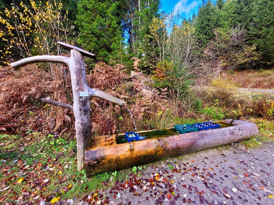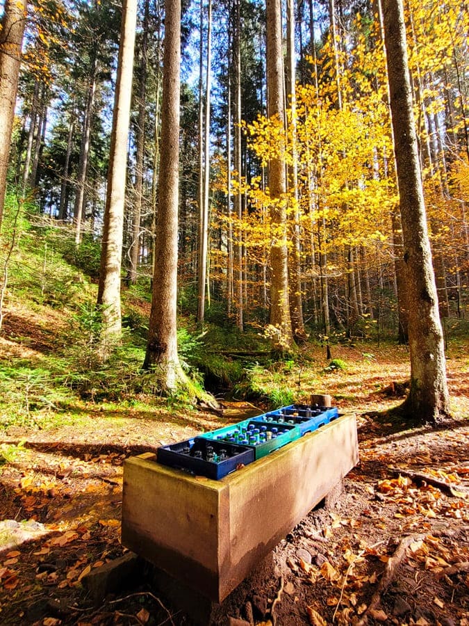 Auf dem Kaltenbachweg wandern wir parallel zum Namensgeber des Weges zuerst durch ein schmales Tal bis zum Rießbrunnen. Hier erwartet uns eine Überraschung: Gekühlte Getränke stehen im Brunnen für uns bereit! Gegen eine Bezahlung in die Kasse des Vertrauens (Tipp: Bargeld mit auf die Tour nehmen) könnt ihr euch hier eine kühle Limo, Schorle, Wasser oder auch alkoholfreies Bier gönnen.