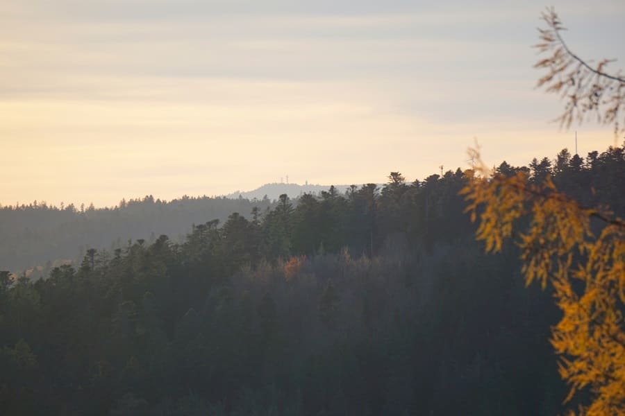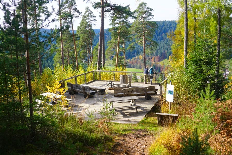 Mit ca. 6,5 Stunden Gehzeit ist dieser Weg vergleichsweise lang. Wir sind Ende Oktober unterwegs und die Sonne steht immer tiefer. An einem Aussichtspunkt können die Aussichten genossen werden, die bei den heutigen perfekten Wetterverhältnissen sogar bis zum höchsten Berg des Nördlichen Schwarzwalds, der Hornisgrinde, reichen.