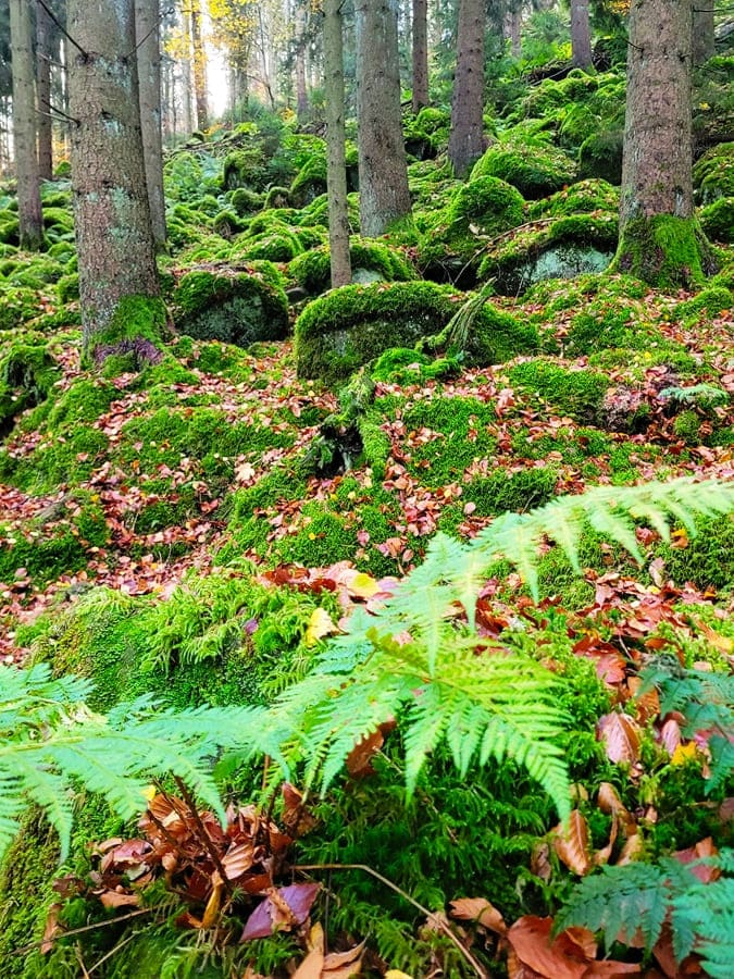 Auf Waldpfaden, die oft stark verwurzelt sind, wandern wir entlang bemooster Felsen und trotz der herbstlichen Jahreszeit immer noch in kräftigem Grün stehenden Farnen in Richtung Schöllkopf. Auf dem gesamten Weg stehen mehrere Informationstafeln, die Auskünfte z.B. über den gesundheitlichen Aspekt der Heidelbeere geben. Heidelbeeren an sich können wir leider keine mehr entdecken: Ende Oktober ist halt keine Heidelbeerzeit mehr.