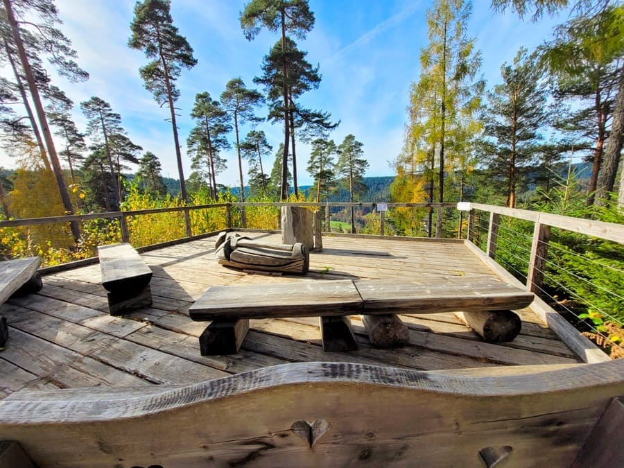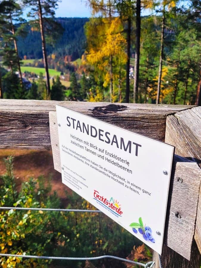Die Aussichtsplattform ist komplett aus Holz errichtet und dient sogar als Hochzeits-Location. Denn: Sowohl hier als auch an drei weiteren Wegpunkten am Heidelbeerweg (Erdbeerplatte sowie Wildgehege) dürfen Verliebte sich das „Ja-Wort“ geben.