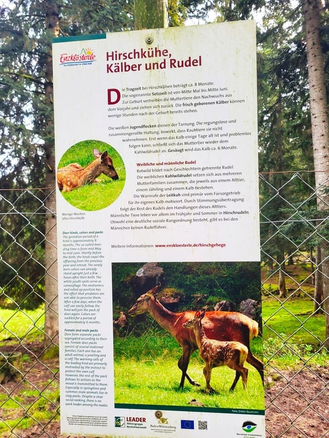 Am Rotwildgehege Enzklösterle gibt es nun sogar die dritte Möglichkeit, sich im Rahmen einer Trauung das „Ja-Wort“ zu vergeben. Lohnenswert ist ein Besuch des Geheges im Mai/Juni: Dann ist die Zeit der kleinen Kälber gekommen. Ansonsten können hier Hirsche im Herbst bei der Brunft beobachtet werden: Heute jedoch scheinen die Tiere sich ein wenig Ruhe zu gönnen. Sie befinden sich ein wenig entfernt von der Besucherplattform und wir können Sie nur dank Kamera näher an uns heran holen. Für Erfrischung in flüssiger Form sorgen auch am Rotwildgehege wieder gekühlte Getränke in einem Brunnen.