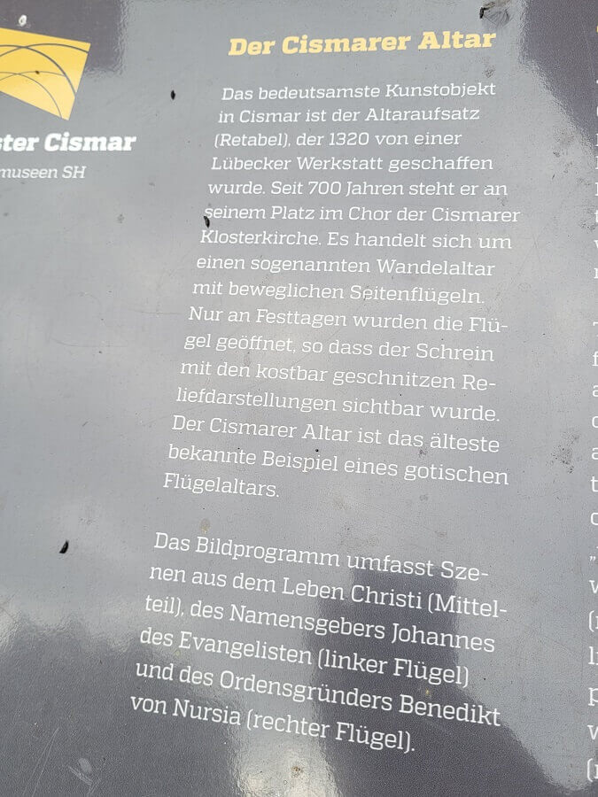 Nun erreichen wir mit dem ehemaligen Benediktinerkloster Cismar einen besonders geschichtsträchtigen Ort in der Urlaubsregion OstseeFerienLand. Die mittelalterliche Abtei beeindruckt durch ihre historische Atmosphäre. Bekannt ist das Kloster Cismar für den „Cismarer Altar“. Er gilt als einer der ältesten erhaltenen Flügelaltare der Welt.