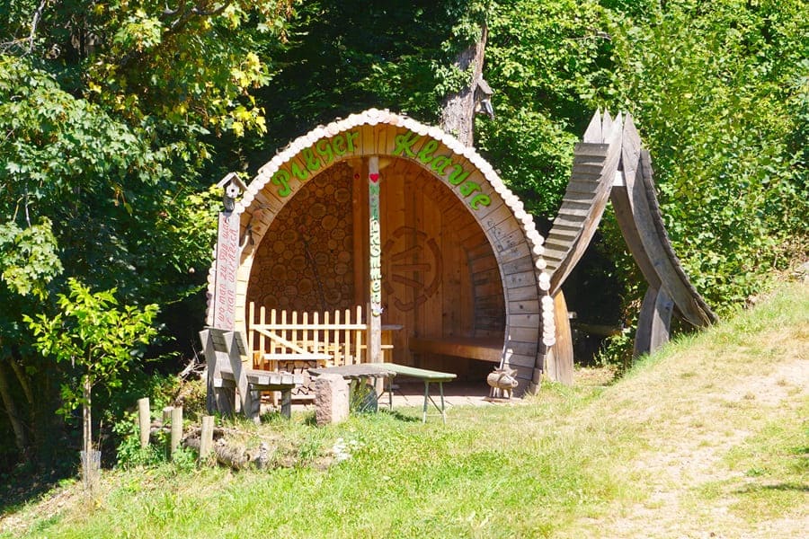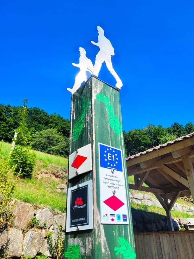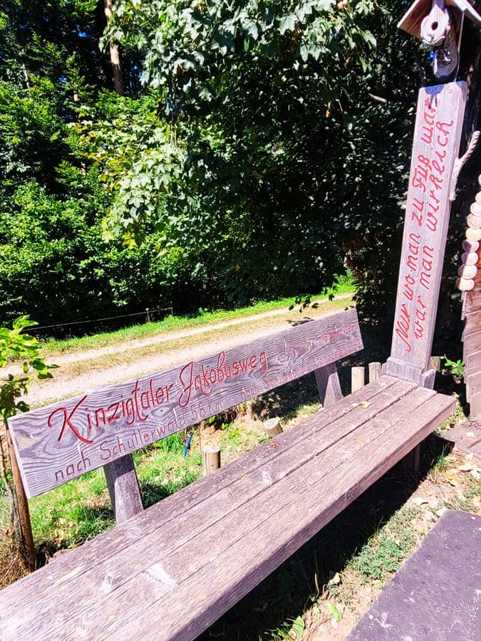 Kurz vor dem Oberen Bauernhof erreichen wir die Pilger-Klause. Eine Schutzhütte mit mehreren Sitzgelegenheiten. Durch das Kinzigtal führt auch der Kinzigtäler Jakobusweg, auf dessen Route wir uns hier nun ebenfalls befinden. Am Oberen Bauernhof gibt es den nächsten kleinen Naturkühlschrank. Stets bergauf erreichen wir Hausach-Dorf und dürfen von hier aus einen letzten kleinen Aufstieg hinter uns bringen. Nicht umsonst heißt der Hausacher Bergsteig Bergsteig.