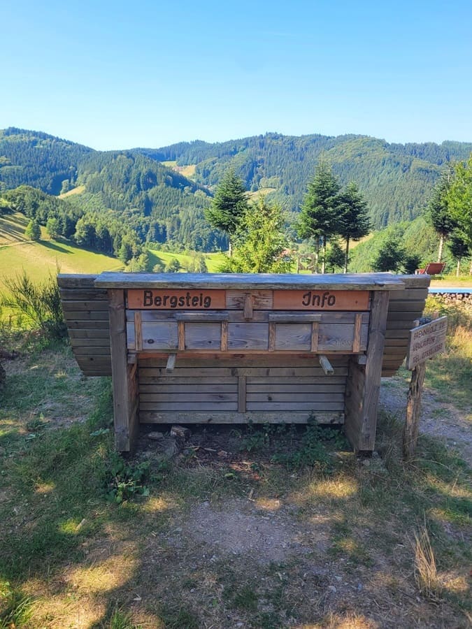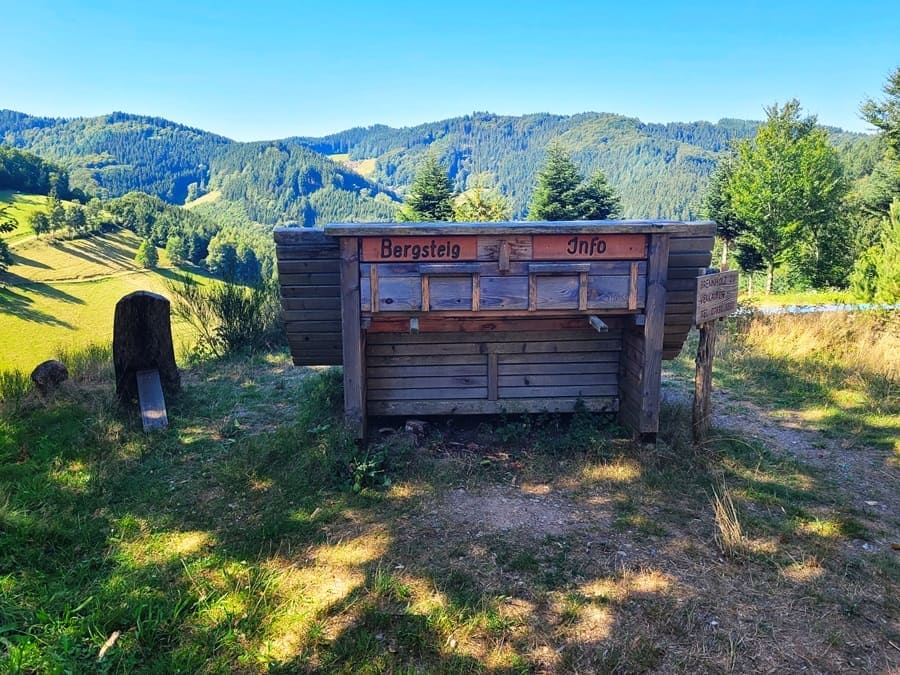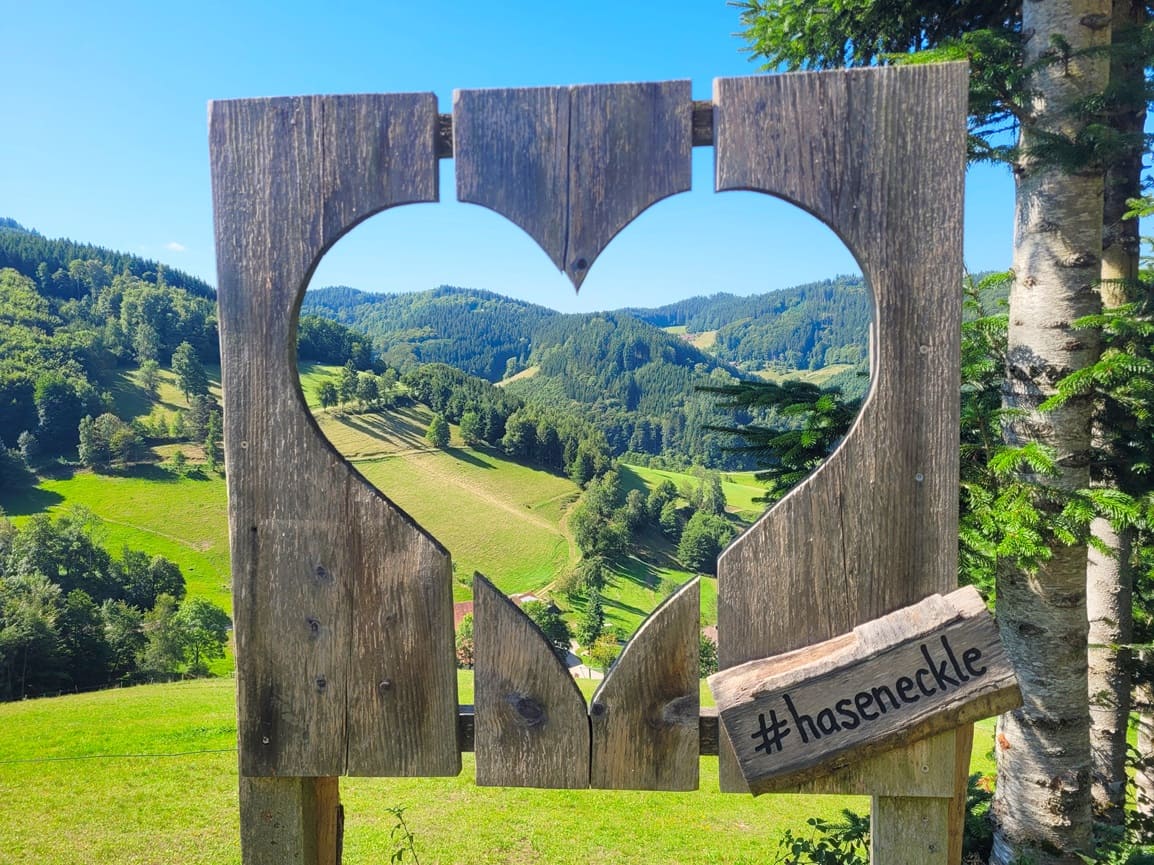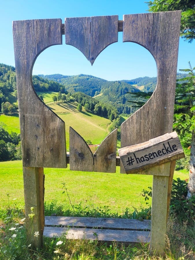 Den Wald verlassend, steuern wir schnurstracks auf eine Wellnessliege zu. Im ersten Moment ist noch gar nicht absehbar, wie genial die Aussichten von ihr sein werden. Wir haben den Wegpunkt Haseneckle erreicht. An der Ruhebank gibt es diverse Broschüren zu Wanderwegen in der Region. Nach den ersten Höhenmetern Aufstieg auf dem Hausacher Bergsteig legen wir hier die erste Trinkpause ein und genießen die fantastischen Aussichten. Das ideale Postkartenmotiv stellt natürlich das „hölzerne Herz“ dar.