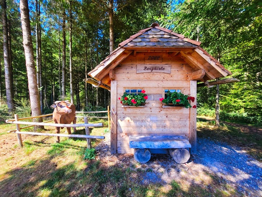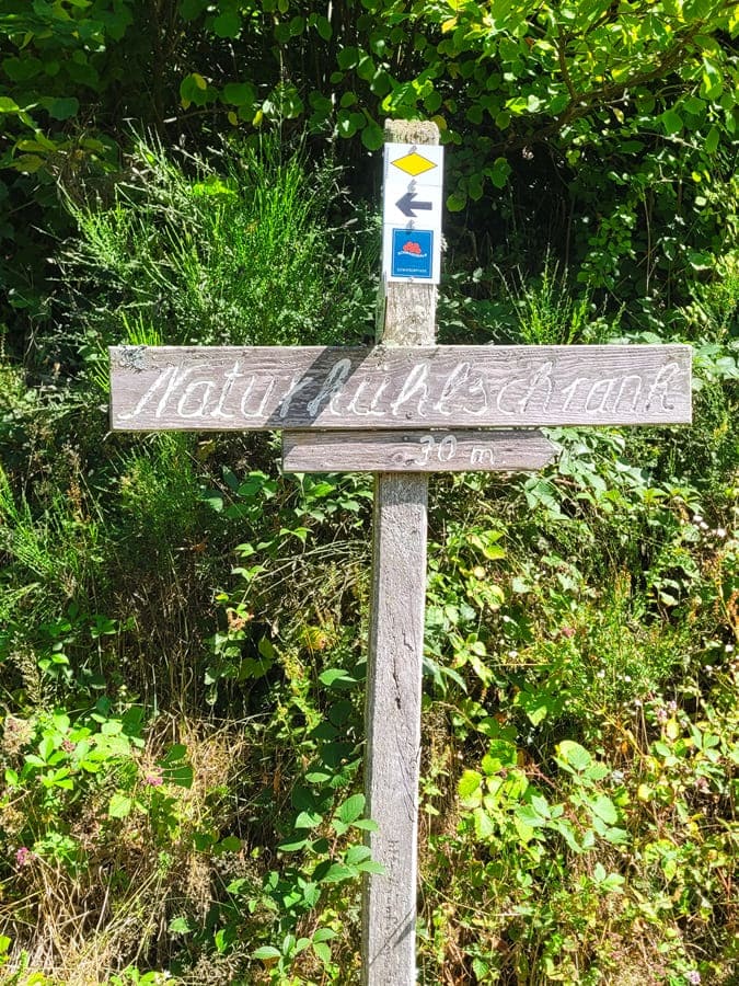 Fangen wir mal mit dem Berghisle an. Das ist noch recht neu und erst im Jahr 2022 aufgestellt worden. Wenn ihr es betretet erwartet euch wohl was genau? Richtig: Getränke. Ihr merkt schon: Verdursten könnt ihr auf dem Hausacher Bergsteig nicht. Neben dem Berghisle steht eine Kuh und regt sich nicht. Kein Wunder; ist sie doch eher eine Attrappe. Wir haben den höchsten Punkt der heutigen Wanderung erreicht und können weit über den Schwarzwald blicken.