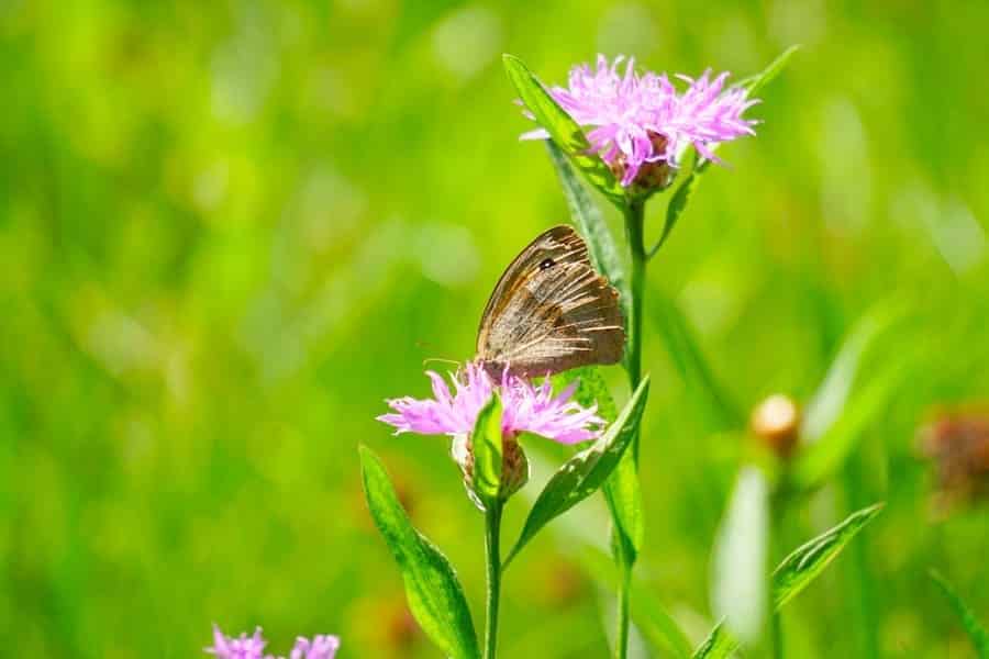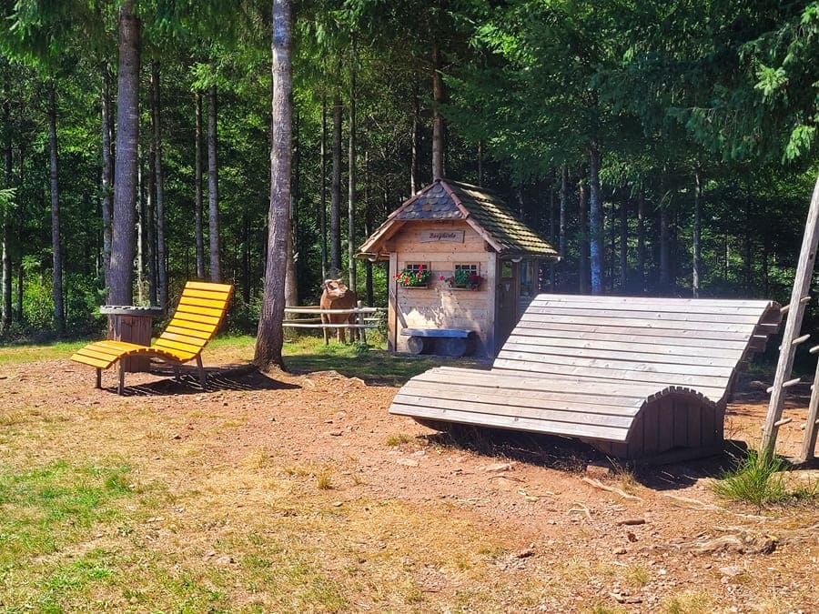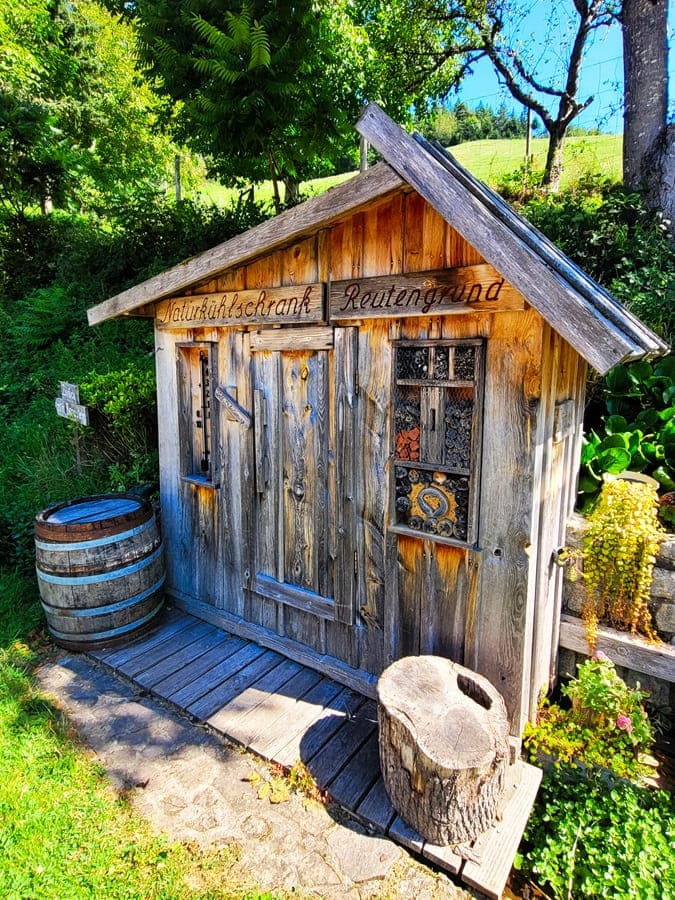 Auf dem Weg zur Hauserbacher Kapelle erfolgt ein erster kleiner Abstieg hinunter ins Tal. Die Wiesen sind gesäumt mit bunten Blumen und zahlreichen Schmetterlingen. Das Wild in einem Wildgehege hat sich bei den heutigen, hohen Temperaturen auch lieber in den Schatten zurückgezogen. Wir haben den Reutegrund mitsamt Hof und Naturkühlschrank erreicht.