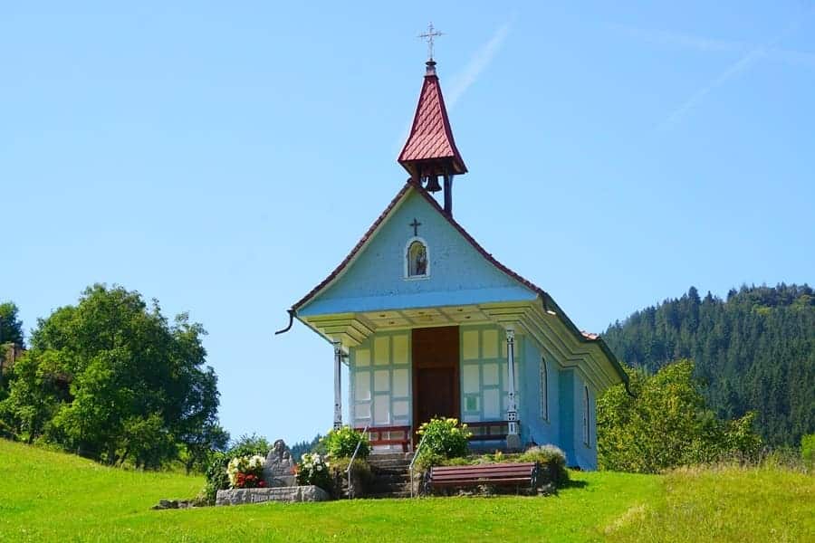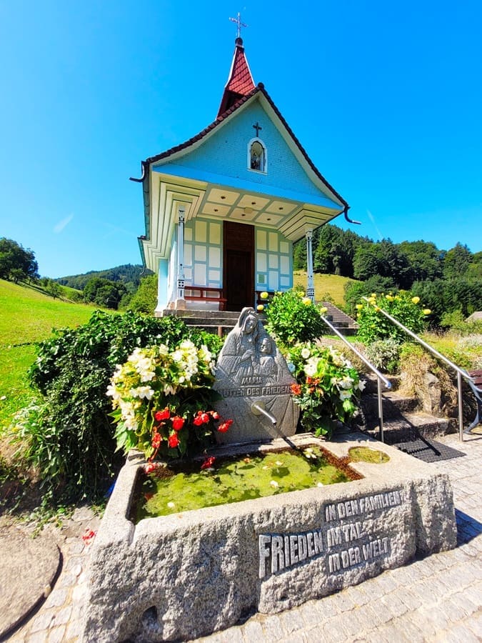 Die Kreuzbergkapelle ist dann das letzte Highlight dieses abwechslungsreichen Wanderwegs, sie liegt einige Meter abseits des Weges. An der Abzweigung zur Kapelle befindet sich noch eine Hütte mit Grillstelle. Eine Grillstelle, die wohl auch weniger schönen Tagen wie dem heutigen sicherlich gut besucht sein dürfte. Wir machen uns auf die letzten Meter Wanderweg zum Wanderparkplatz Hausach Wassertretstelle, wo kaum noch ein Parkplatz frei ist. Nach etwas mehr als 5 Stunden Gehzeit erreichen wir den offiziellen Start- und Endpunkt der Tour, die Burg Husen. Und steigen hier wieder hinab in Richtung Ortszentrum. Hier könnt ihr nahe der Kirche noch ein Eis schlecken, Kaffee trinken oder eine Kleinigkeit essen.
