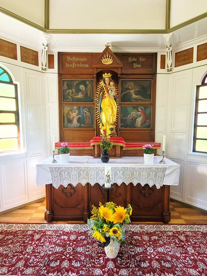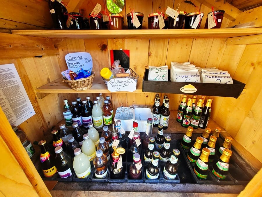 Noch bevor wir die Kapelle in Augenschein nehmen staunen wir über den nächsten Naturkühlschrank am Klausmannshof. Diesen hatten wir gar nicht auf der Rechnung. Zumal hier auch kleine Snacks in Form von Schokoriegeln und selbstgemachten Nussecken sowie Linzer Torte angeboten werden. Na wenn das nicht ein toller Platz für eine weitere Pause ist!