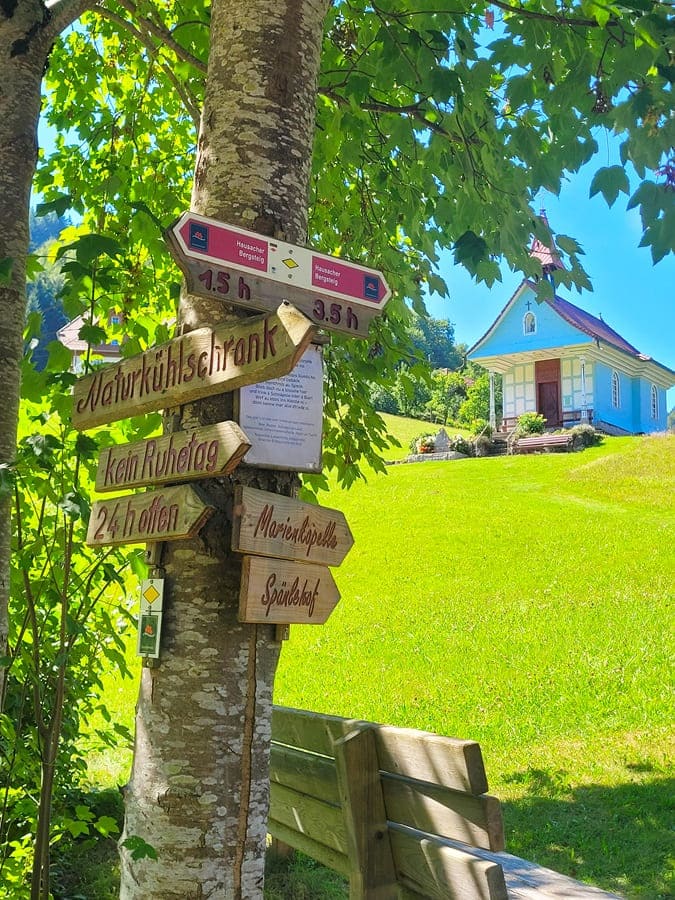 Der Zufall will es, dass die Bewohner des Klausmannshofes gerade mit dem Auto vorfahren und wir in ein Gespräch kommen. Dabei erfahren wir, dass der Hausacher Bergsteig ganzjährig eine beliebte Wandertour ist. Es ist 13 Uhr: Die Glocken der Kapelle läuten eine ganze Weile lang. Die Kapelle am Klausmannshof wurde vor Kurzem erst, mehr oder weniger, „generalsaniert“ und leuchtet in der prallen Mittagssonne in einem kräftigen Hellblau-Ton.