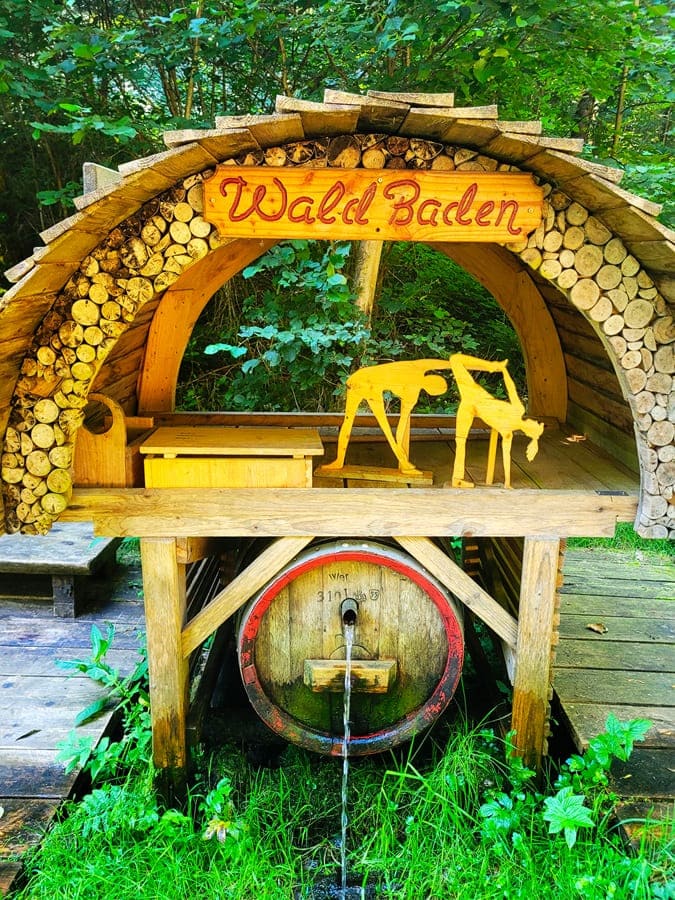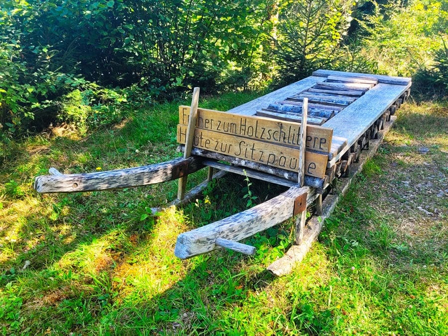 Auf dem Weg zum höchstgelegensten Punkt des Hausacher Bergsteigs wandern wir entlang eines alten, großen Holzschlittens und einem weiteren Brunnen entlang, bevor wir den Weg- und Aussichtspunkt Uhlseppe-Ecke erreicht haben.