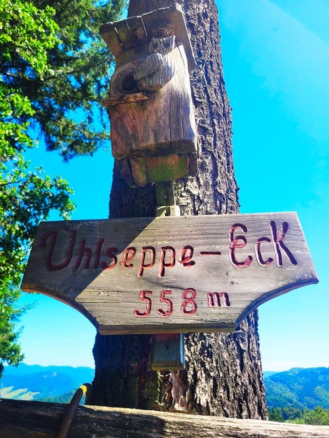 „Mehr Schwarzwald geht nicht“: Mit diesem Schild werden wir am grandiosen Aussichtspunkt Uhlseppe-Eck empfangen. Die Augen wissen gar nicht so recht, wo sie zuerst hinschauen sollen: Berghisle, Wellnessbänke, Sitzgruppe, eine Kuh, spektakuläre Aussichten.