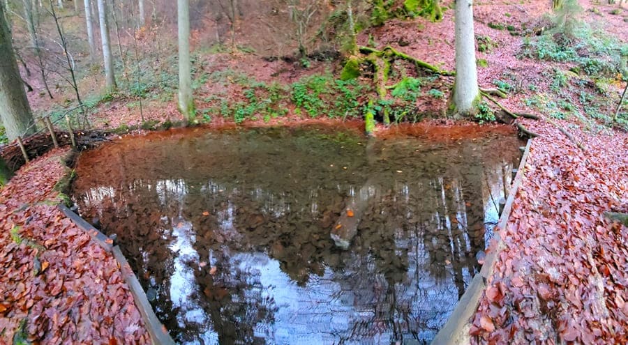Salzwoog ist eine kleine Ortschaft ohne Einkehrmöglichkeit. An einem Ortsschild können wir erkennen, dass es lediglich 6 km bis nach Dahn sind. Dahn: Bekannt für das Dahner Felsenland mit ebenfalls zahlreichen tollen Wanderwegen. Frisch gestärkt machen wir uns wieder auf den Weg. Auf einem schmalen Pfad wandern wir parallel zu einer Straße zur Schwambornquelle.