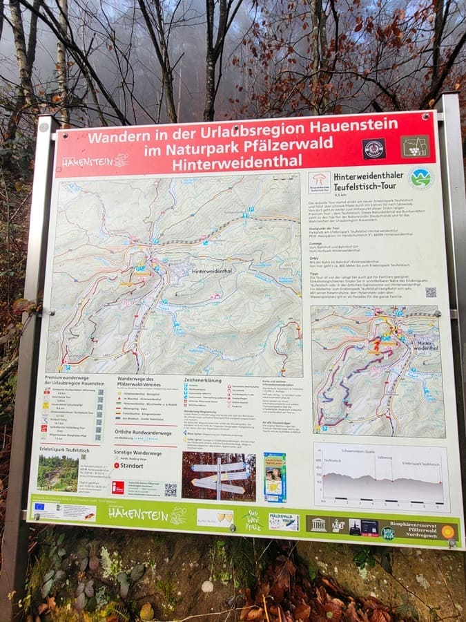 Los geht`s: Praktischerweise verfügt Hinterweidenthal über einen Bahnanschluss. Und ab Karlsruhe z.B. könnt ihr mit der Regionalbahn direkt bis nach Hinterweidenthal fahren. Und nur wenige hundert Meter entfernt erreicht ihr dann auch schon den offiziellen Start- und Endpunkt des Wanderwegs am Erlebnispark Teufelstisch, zu welchem wir euch am Ende dieses Berichtes noch ein wenig erzählen werden.