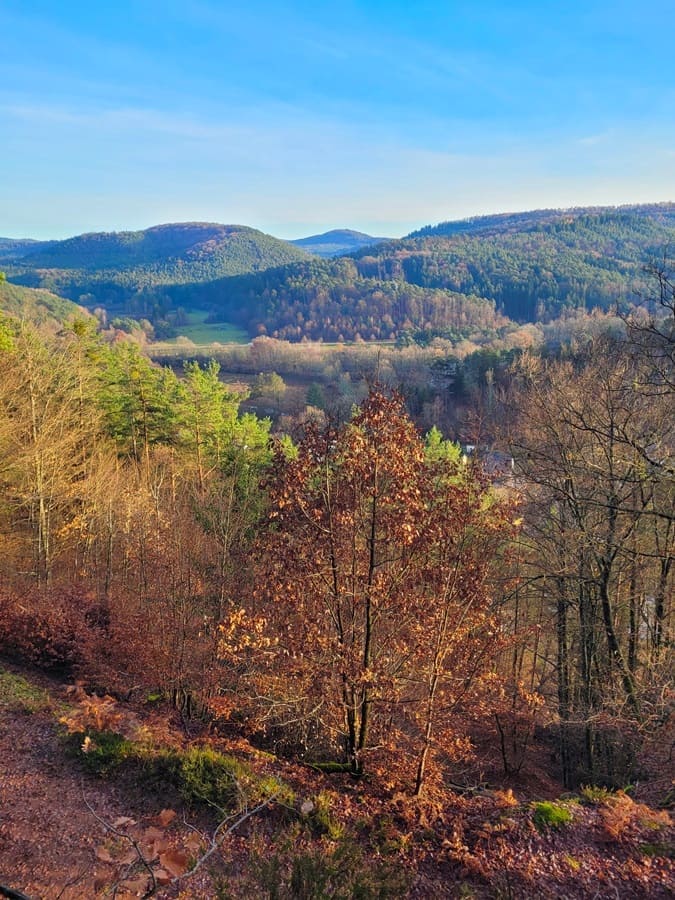 Eine Informationstafel klärt uns auf, dass der Blick in Richtung Wasgau geht. „Wasgau?“ Das ist eine deutsch-französische Mittelgebirgslandschaft, die sich länderübergreifend über Rheinland-Pfalz und die französische Region „Grand Est“, lange Zeit besser bekannt als Elass und Lothringen, erstreckt. Wandern bildet offensichtlich, denken wir uns beim Lesen der Zeilen. Und kommen beim weiteren Wandern doch tatsächlich in Teufelsküche.