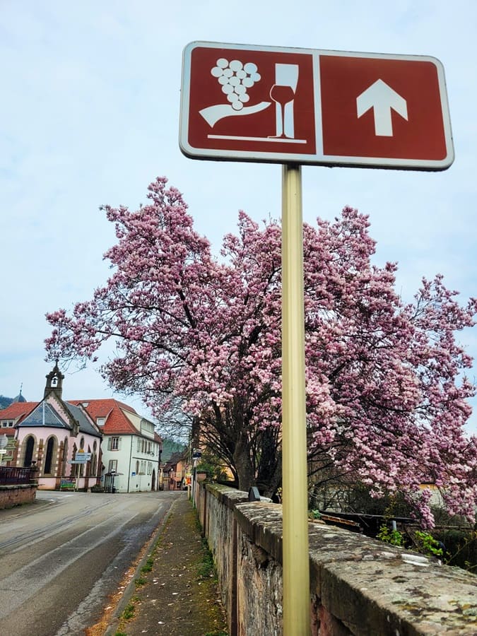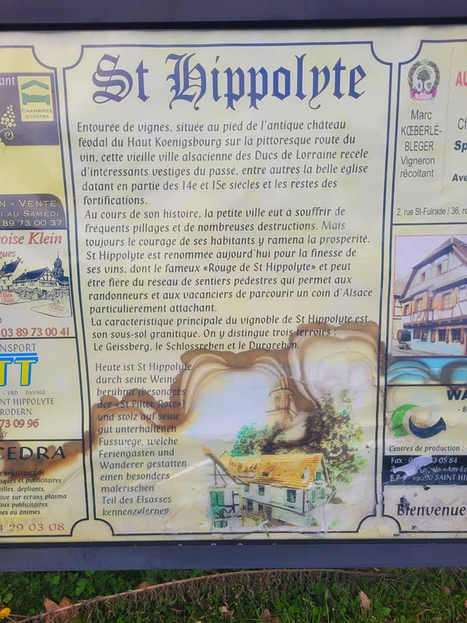 Mitten in Saint-Hippolyte startet nun unsere Tour zur Burg. Saint-Hippolyte ist eine kleine Gemeinde vor den Toren der Stadt Selestat und ist am besten als „Weinort“ zu bezeichnen. Es gibt zahlreiche Winzer und Weinstuben im Ort Und kurz nach dem Beginn unserer Wanderung stehen wir auch schon inmitten eines großen Weinberges, den wir fortan bergauf erklimmen dürfen.