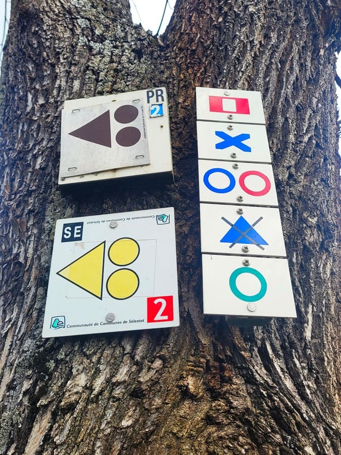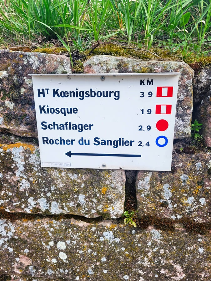 Diverse Wegmarkierungen sind entlang des Weges zu entdecken. Jedoch wissen wir diese meistens nicht so recht zu deuten. Offensichtlich ist allerdings die Tatsache, dass wir am Tag zuvor nur 9 km entfernt in der malerischen Altstadt von Ribeauville gewesen sind, um auf dem Drei Burgenweg gleich drei Burgruinen sowie ein Kapuzinerkloster zu bestaunen. Mit der „Haut-Koenigsbourg“ erwartet uns heute allerdings die mit Abstand größte, besterhaltenste und bekannteste Burg des ganzen Elsasses auf uns.