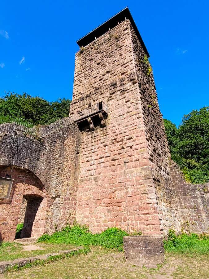 Wahrhaftig thront sie oberhalb von Neckarsteinach und die Aussichten von ihrem begehbaren Aussichtsturm sind prächtig. Gut erhalten ist sie zudem, die synonym auch „Alt-Schadeck“ genannte Burg. Auf einer Informationstafel erfahren wir allerhand über die Geschichte der Burgruine Hinterburg. Ihre Geschichte reicht bis in die Jahre um 1100 zurück. Sie wurde im Laufe der Jahrhunderte mehrfach umgebaut und gar im Dreißigjähren Krieg vollends zerstört.
