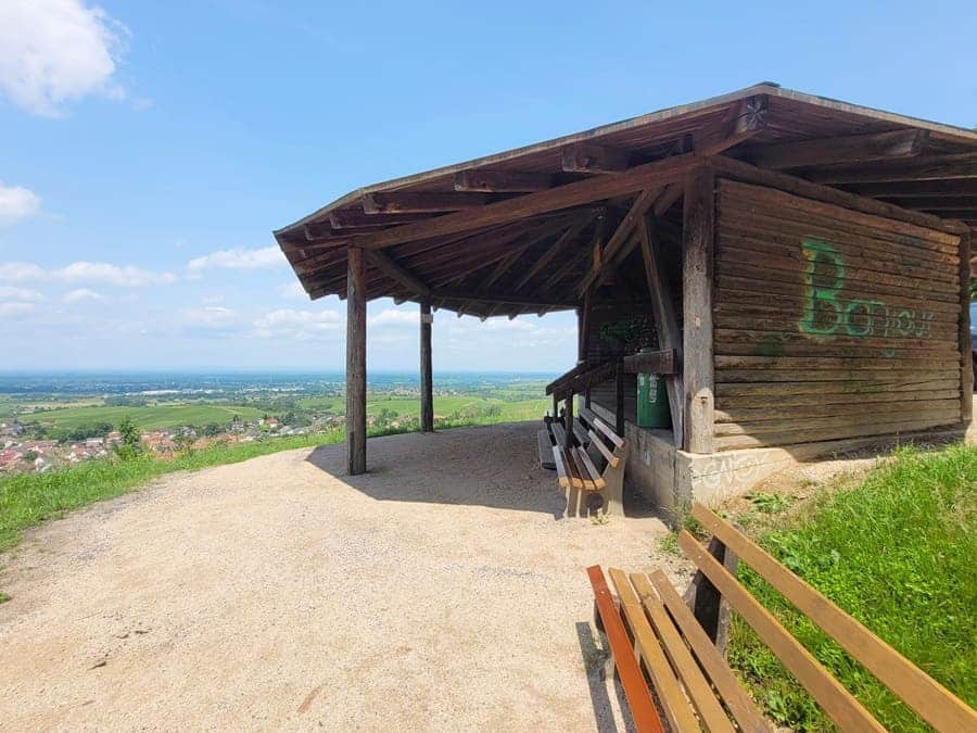 Von der Fatima-Kapelle führt der Rotweinweg zum Aussichtspavillon Eisental. Von hier aus gibt es fantastische Aussichten über Eisental und die Rheinebene bis hin zu den Vogesen. Ein wenig unterhalb des Aussichtspavillons befindet sich die Grillhütte Heißer Stein. Auch hier gibt es mehrere Sitzgelegenheit für eine Rast. Das Wort „Rast“ finden unsere beiden Guides offenbar sehr gut.