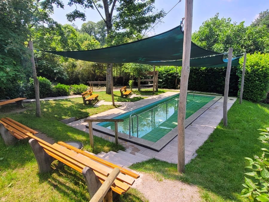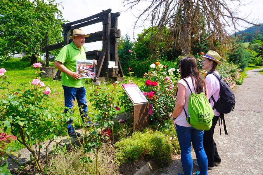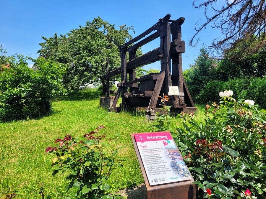 Nur wenige Minuten nach Beginn der Tour erreichen wir auch schon eine alte Trotte. Mit dieser wurden einst Trauben gepresst. Daneben liegt ein schöner Rosengarten und auf der andere Seite des Weges befindet sich der Erlebnisgarten Eisental. Vor allem das Tretbecken ist an heißen Sommertagen beliebt, um sich ein wenig abzukühlen.
