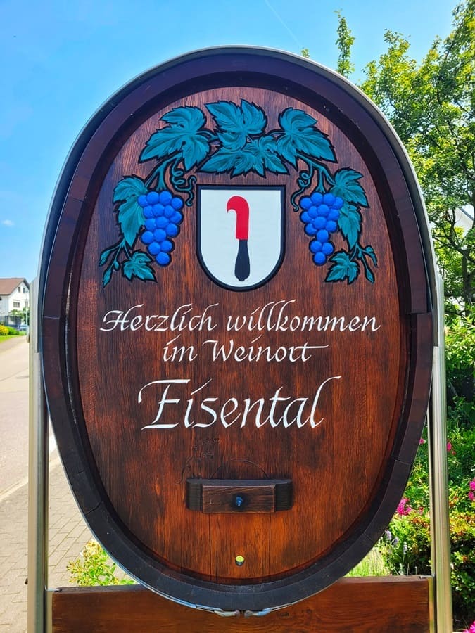 Am Eisentaler Dorfplatz startet der Rotweinweg. Vor Ort könnt ihr euch in einem Dorfladen mit Verpflegung für die Tour versorgen. Oder aber auch nach Beendigung dieser im Gasthof zur Traube einkehren. Da wir eine Guided Tour gebucht haben, erwarten uns hier schon sowohl ein Wein-Guide als auch ein Vertreters des Eisentaler Heimatvereins. Beide werden uns mit allerlei interessanten Informationen zum Rotweinweg, zur Geschichte des Weinbaus und natürlich über die Orte Eisental sowie Affental versorgen.