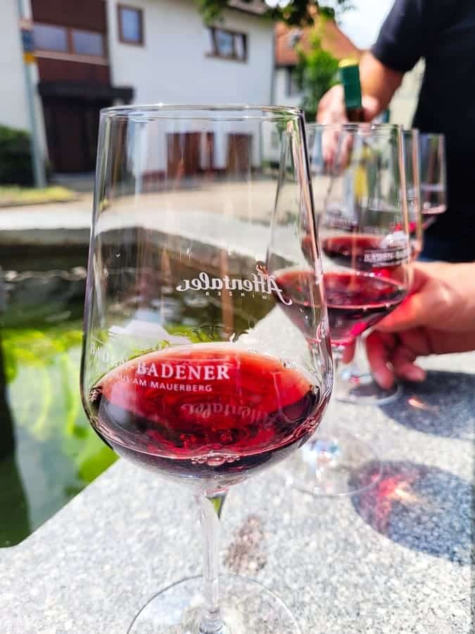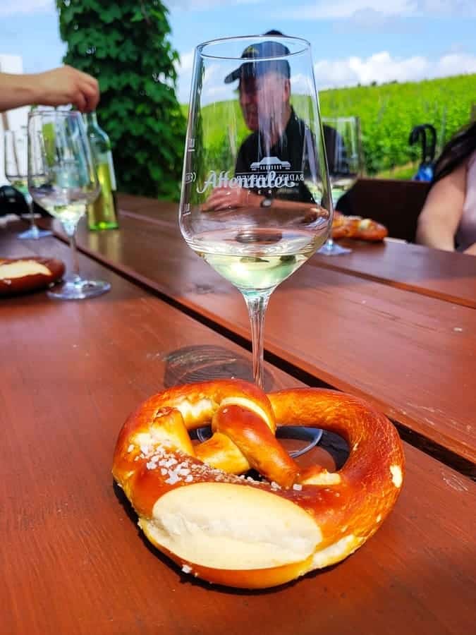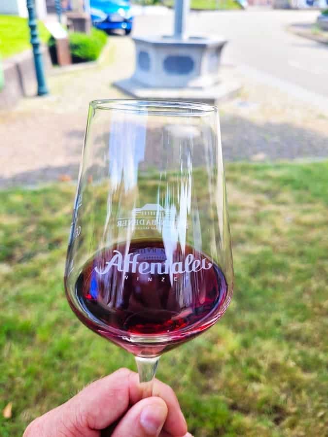 Auch eine Sitzgruppe ist vorhanden, auf welcher wir direkt einmal Platz nehmen und uns das erste Glas Wein der Affentaler Winzer eingeschenkt wird. Unser Wein-Guide kennt sich sehr gut mit den regionalen Weinen aus und weiß vieles über die Produktion und Anbau der hiesigen Weine zu berichten.
