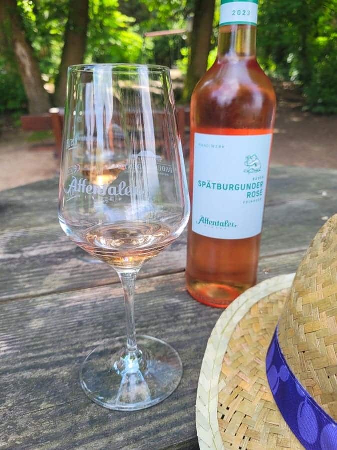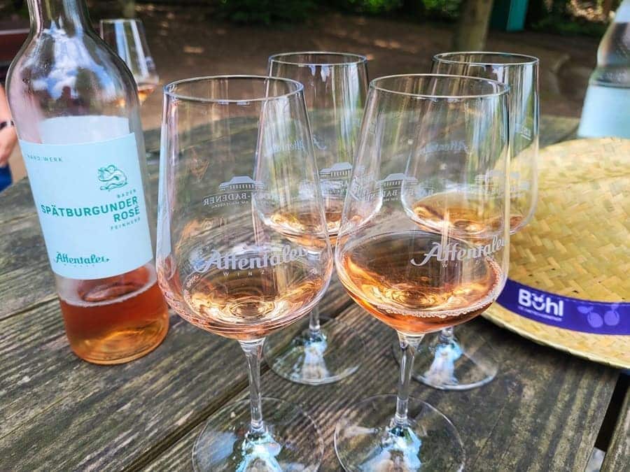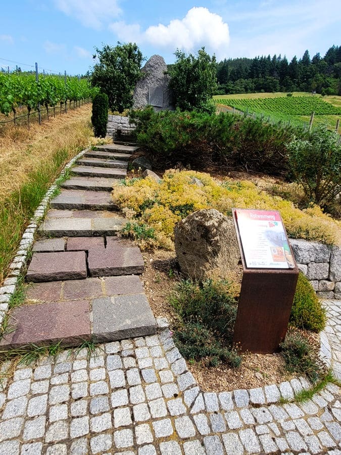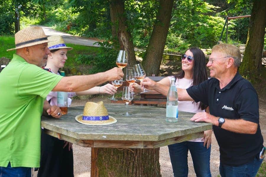 Denn am Heißen Stein legen wir die nächste kleine Pause mitsamt Weinverkostung ein. Schattig ist es hier an diesem sonnigen Tag auch: Da lohnt sich die Verkostung des gekühlten Spätburgunder Rosés gleich doppelt.