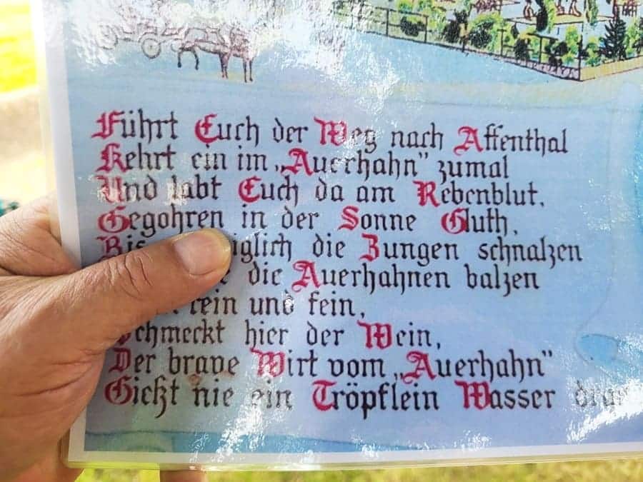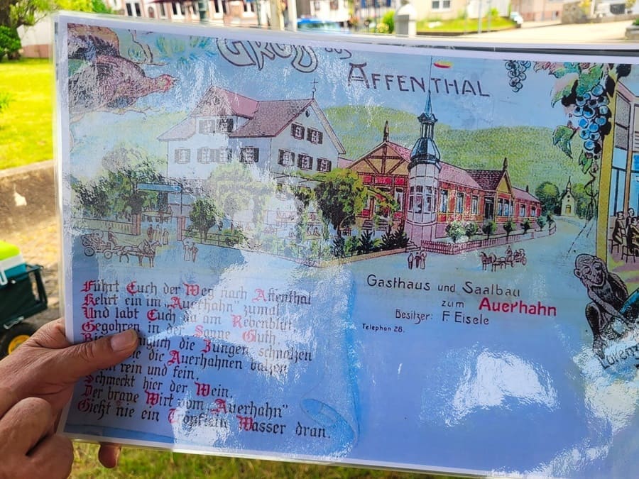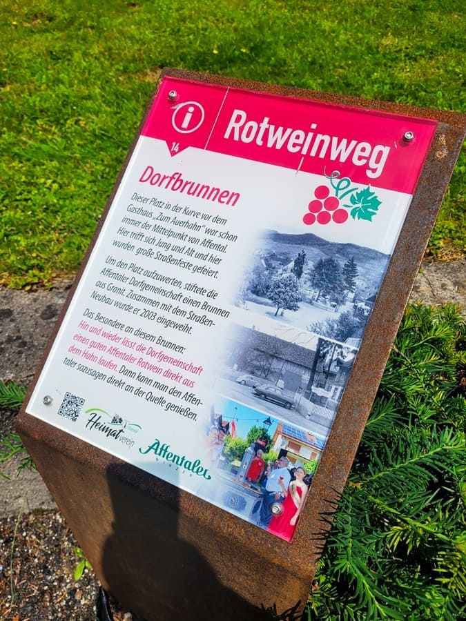 Am Dorfplatz von Affental erfahren wir zweierlei interessante Dinge. Vor vielen Jahren war das Gasthaus Auerhahn über die Grenzen hinaus bekannt. Reiche Kurgäste aus Baden-Baden kamen gerne in das in schönem Jugendstil errichteten Gebäude, um die hiesigen Weine zu verkosten und „zum Tanz zu bitten“. Auch heute gibt es den Auerhahn noch, der zu einer Einkehr einlädt. Ein Kuriosum in Affental ist der Brunnen am Dorfplatz.