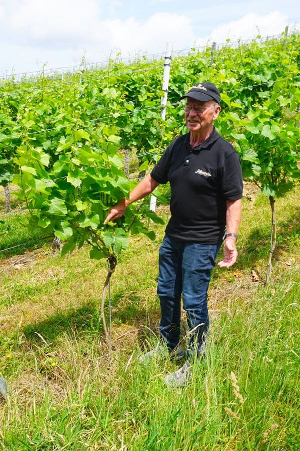 Kaum ist das erste Glas Weißwein geleert, geht es auch schon weiter in Richtung Fatima-Kapelle. Nicht jedoch, ohne einen Zwischenstopp zwischen den Rebstöcken einzulegen. Es ist Anfang Juni und die Trauben benötigen noch einige Zeit, bevor sie gelesen werden können. Das jedoch hält unseren Wein-Guide nicht davon ab, anhand der Reben Informationen zum Entwicklungsstand der Trauben zu geben.