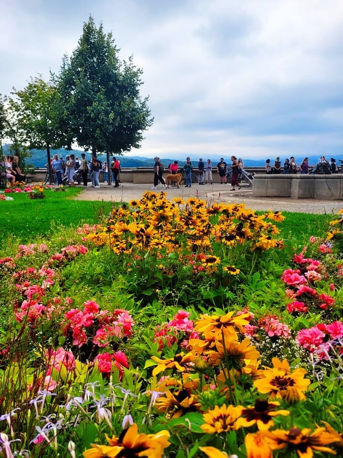 Durchaus aussichtsreich geht es vom Schloss aus zu. Wir können die Straßenzüge der Altstadt bestens erkennen und sind verwundert über mehrere Skisprungschanzen. Eben noch in der Altstadt spazierend gewesen, wären wir nie auf die Idee gekommen, dass sich in einem Waldstück vor den Toren der Stadt mehrere Skisprungschanzen befinden!