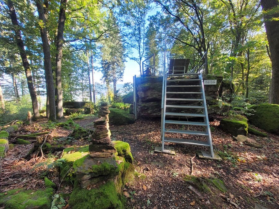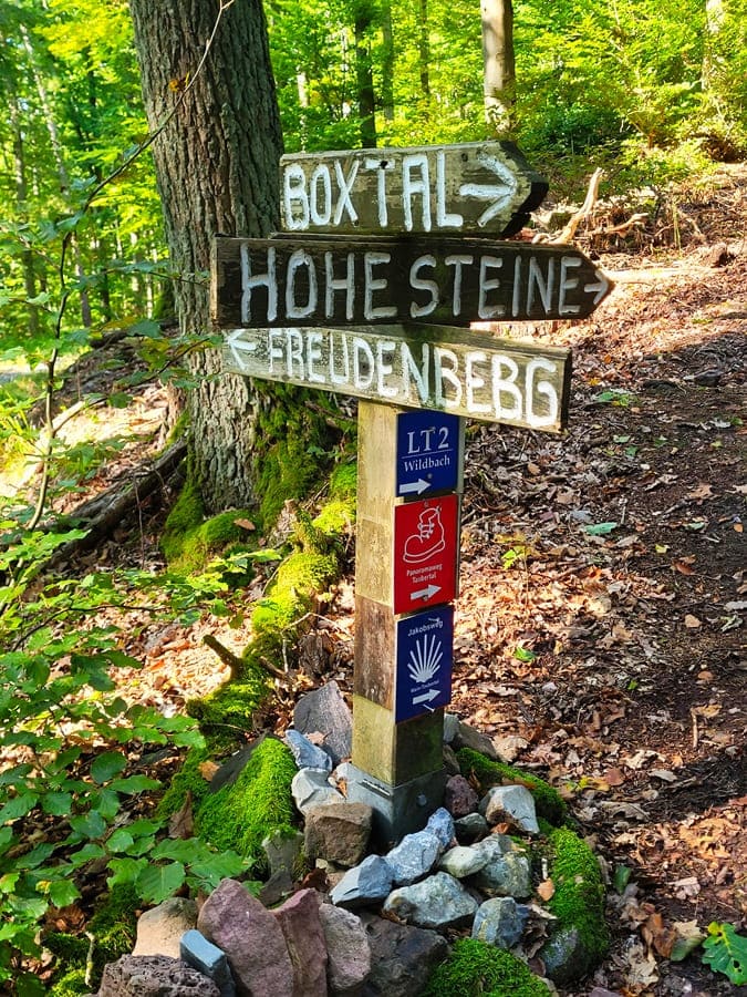 Die Etappe 5 führt nun auf einem längeren Teilstück über schattige Waldabschnitte. Es ist Herbst: Überall sind Eicheln, Kastanien und die ersten Pilze am Wegrand zu entdecken. Mit dem Naturdenkmal „Hohe Steine“ erreichen wir ein bemoostes Felsenmeer und legen einen Stopp an einer kleinen Aussichtsplattform ein.