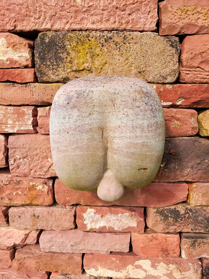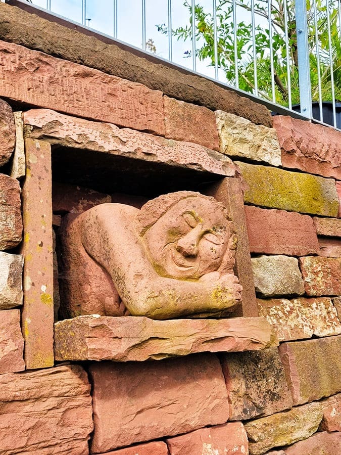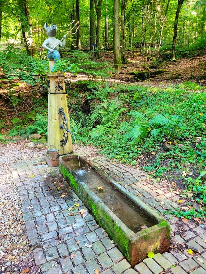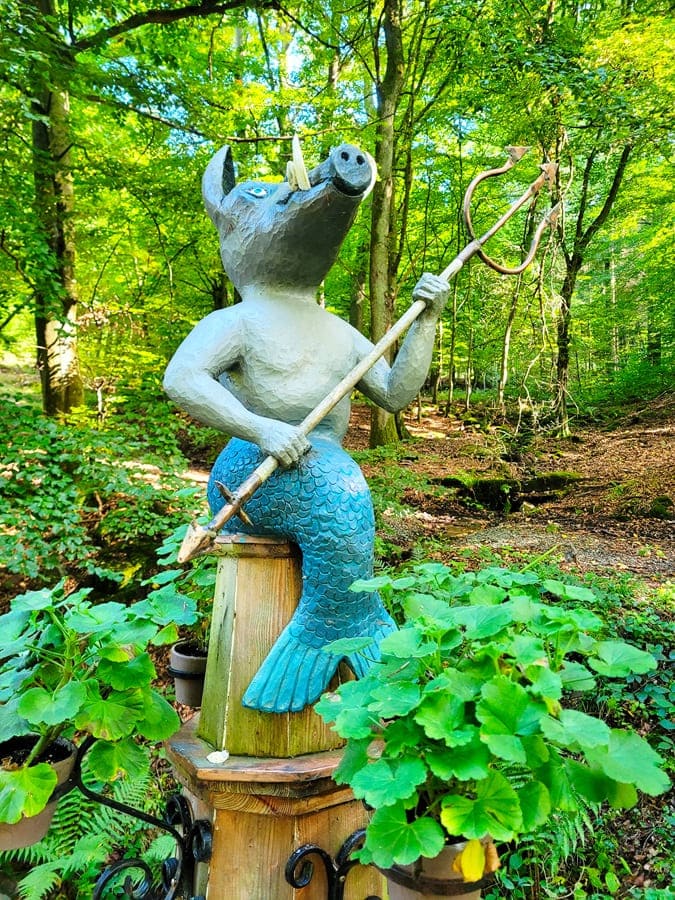 Gemütlich auf der Himmelsliege fläzend, können wir durch den dicht bewachsenen Wald auf dem Main ein größeres Kreuzfahrtschiff beobachten. Nach einer kurzen Trinkpause folgen wir den Wegmarkierungen weiter in Richtung Freudenberg und erreichen eine Brunnen mitsamt „Määhock“-Skulptur.