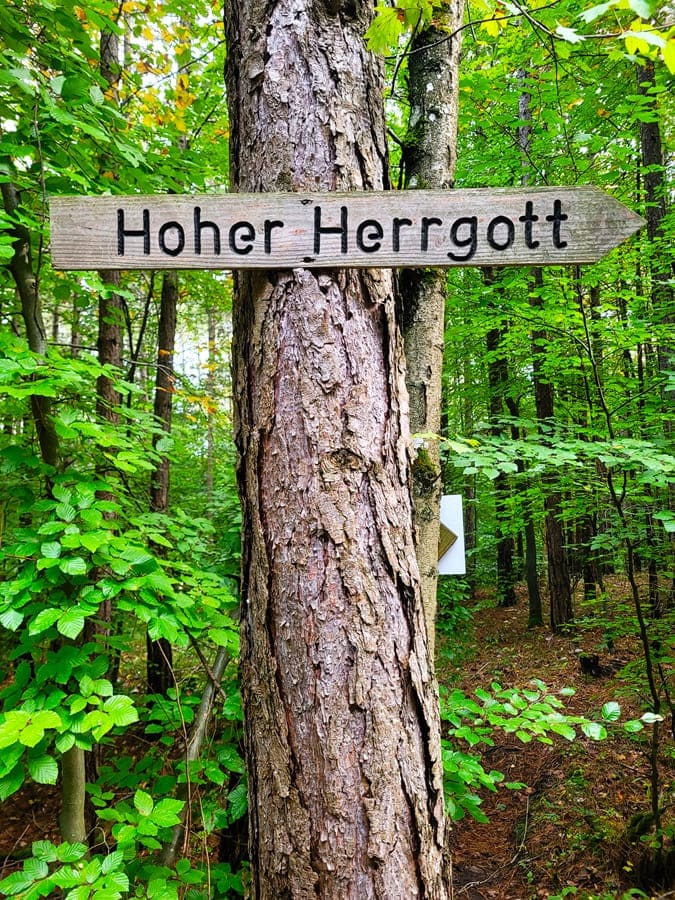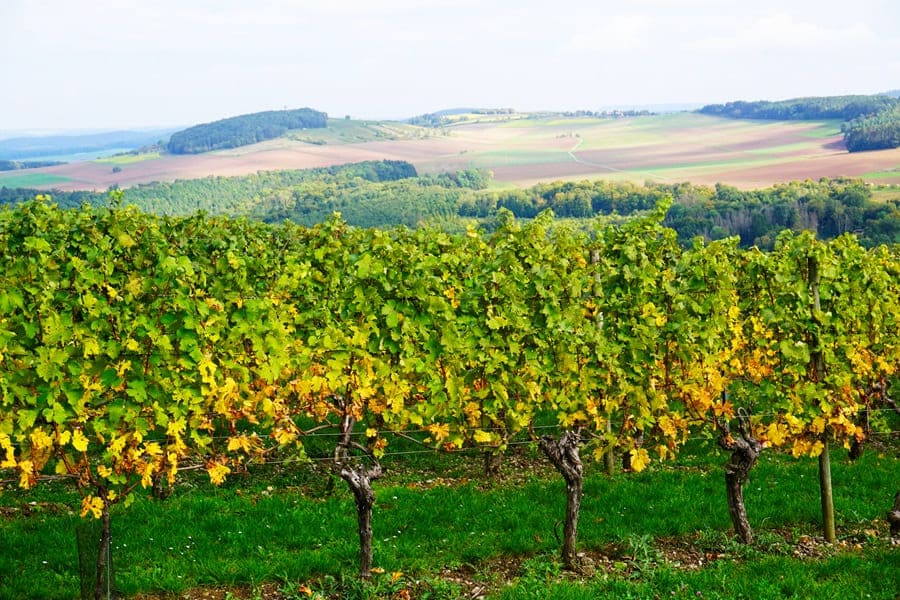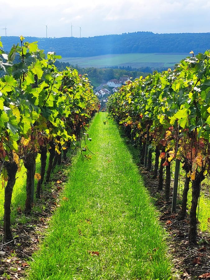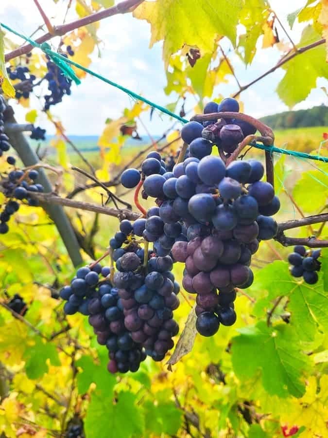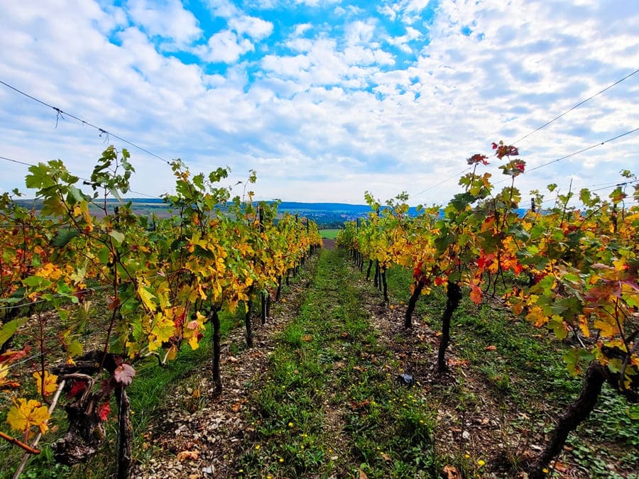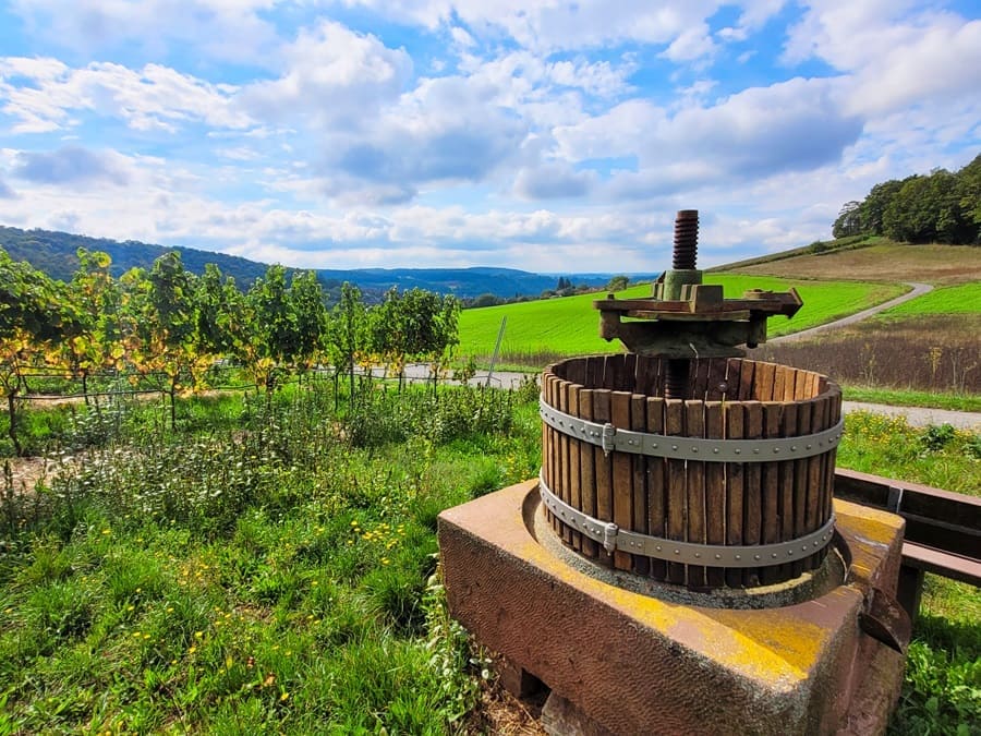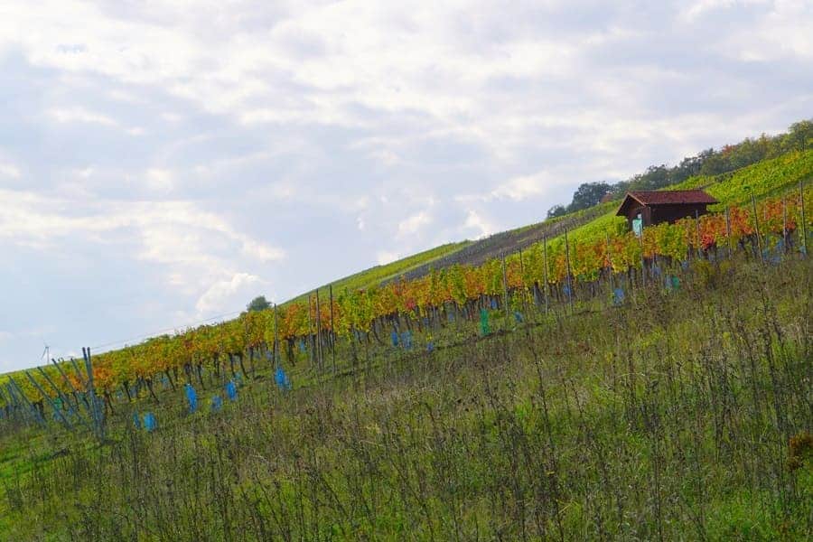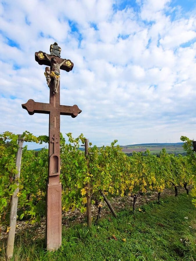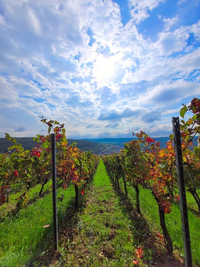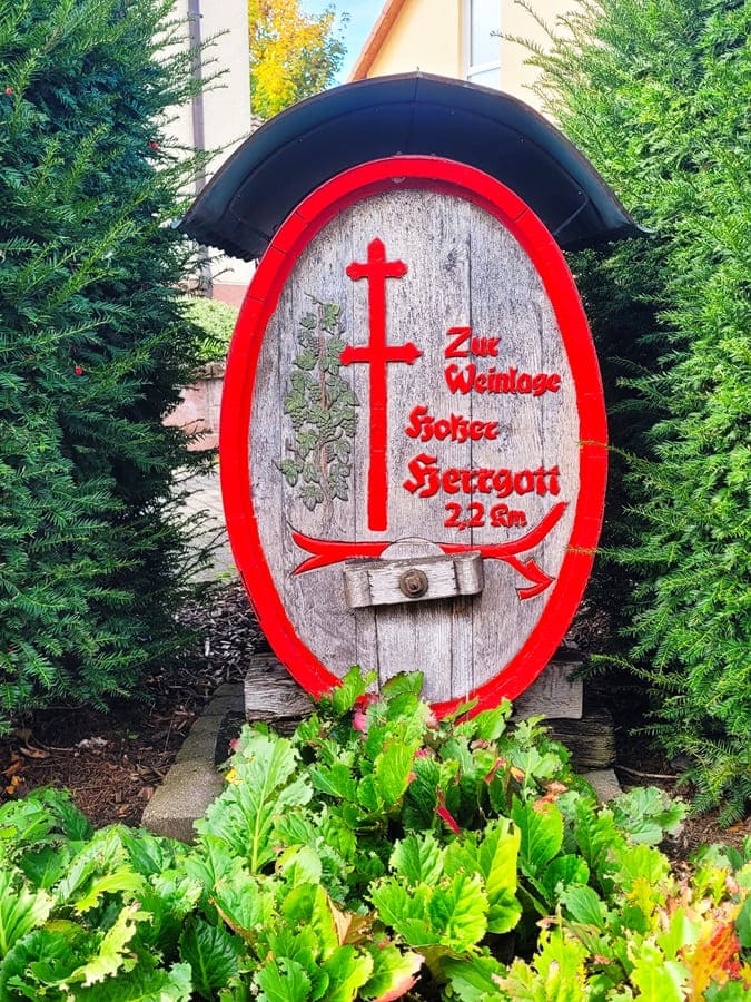 Weinberge: Das ist ein weiterer thematischer Schwerpunkt dieses Rundwanderweges. Weinstöcke gibt es wahrhaftig reichlich entlang des Weges. Zwar sind wir im Herbst auf dieser Strecke unterwegs gewesen und die meisten Rebstöcke trugen schon keine Trauben mehr. Doch auch im Herbst ist es wunderschön, zwischen den unterschiedlich gefärbten Weinblättern über den Weinberg „Hoher Herrgott“ entlang zu wandern.