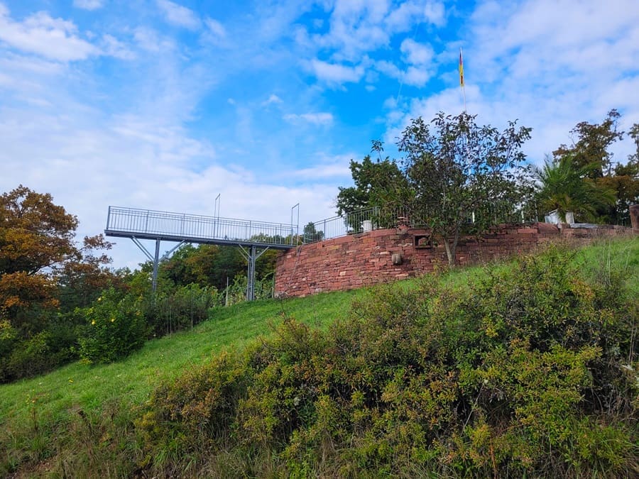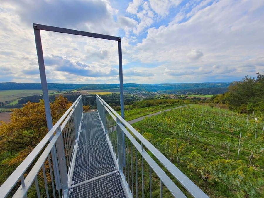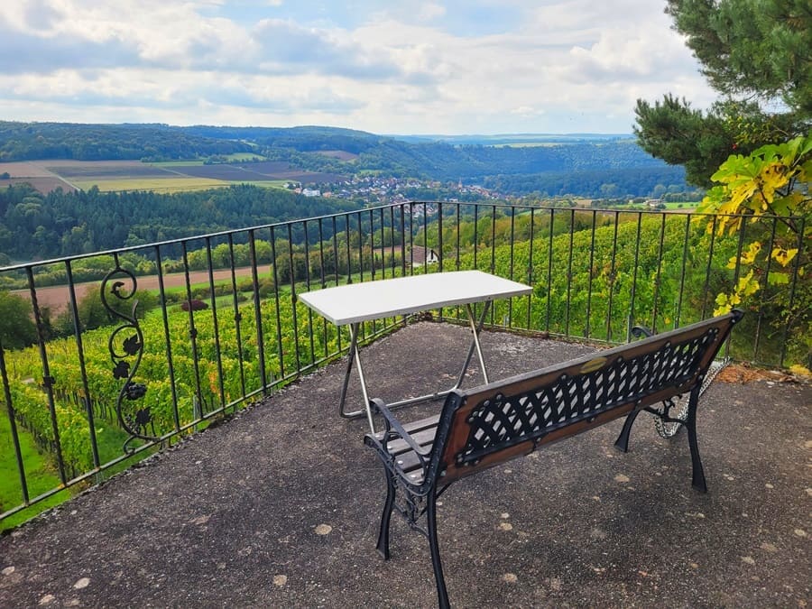 Den wohl schönsten Aussichtspunkt gibt es ca. einen Kilometer vor Beendigung des Rundwanderwegs an der Weinberglage Lindelbacher Ebenrain. Über einen Steg, der als Aussichtsplattform dient (Achtung: Betreten auf eigene Gefahr!), habt ihr eine fantastische Aussicht auf Lindelbach und den Weinberg.