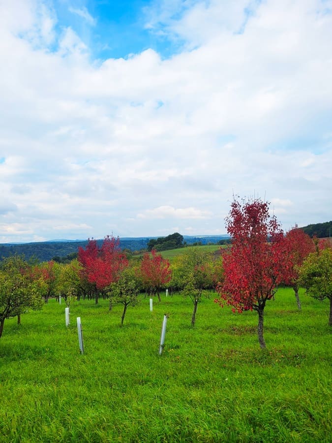Der Panoramaweg trägt seinen Namen zurecht: Wir wandern entlang einiger Streuobstwiesen und je höher wir kommen, umso besser sind die Aussichten auf den Main. Besonders erwähnenswert auf dem Panoramaweg Taubertal sind die hervorragenden Ausschilderungen. Direkt ins Auge fallen die roten Markierungen mit einem Wanderschuh als Logo.